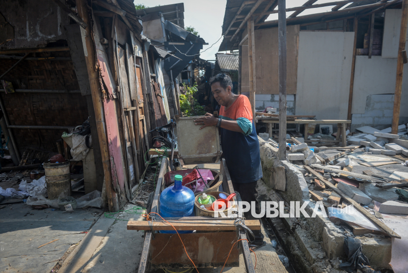 Warga terdampak relokasi membongkar pintu rumahnya di Kamal, Kalideres, Jakarta, Selasa (31/3/2026). Pemerintah Kota Jakarta Barat merelokasi 128 kepala keluarga (KK) atau 606 jiwa yang terdampak pembukaan lahan pemakaman baru di Kelurahan Pegadungan dan Kamal ke sejumlah rusunawa sebagai upaya pengembalian fungsi lahan milik Pemprov DKI Jakarta. (FOTO : ANTARA FOTO/Putra M. Akbar)