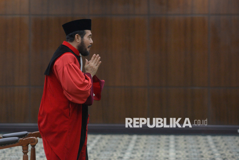 Hakim Mahkamah Konstitusi (MK) purnabakti Anwar Usman berjalan keluar usai acara wisuda purnabakti dan penyambutan hakim konstitusi di Gedung Mahkamah Konstitusi, Jakarta, Senin (13/4/2026). Mahkamah Konstitusi menggelar wisuda purnabakti Anwar Usman serta menyambut hakim konstitusi baru Adies Kadir dan Liliek Prisbawono Adi. Anwar Usman mengakhiri masa pengabdiannya sebagai hakim konstitusi selama 15 tahun pada 6 April 2026. Sedangkan, Liliek Prisbawono Adi resmi menjadi hakim konstitusi menggantikan Anwar Usman yang memasuki masa pensiun. Pada kesempatan yang sama, MK juga menyambut Hakim Konstitusi Adies Kadir yang telah lebih dahulu mengucapkan sumpah jabatan sebagai hakim konstitusi menggantikan Arief Hidayat. (FOTO : Republika/Prayogi)