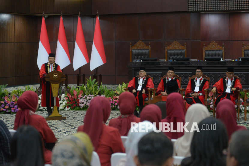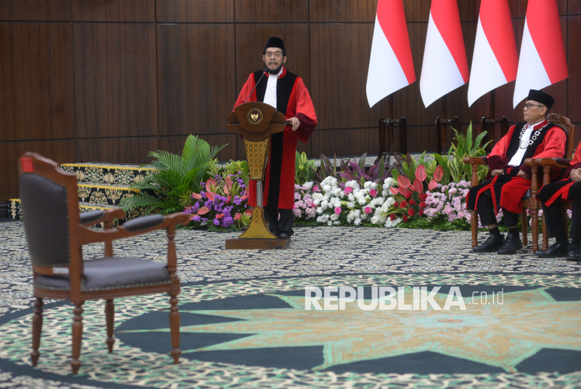 Ketua Hakim Mahkamah Konstitusi (MK) Suhartoyo menyampaikan sambutan dalam acara wisuda purnabakti dan penyambutan hakim konstitusi di Gedung Mahkamah Konstitusi, Jakarta, Senin (13/4/2026). Mahkamah Konstitusi menggelar wisuda purnabakti Anwar Usman serta menyambut hakim konstitusi baru Adies Kadir dan Liliek Prisbawono Adi. Anwar Usman mengakhiri masa pengabdiannya sebagai hakim konstitusi selama 15 tahun pada 6 April 2026. Sedangkan, Liliek Prisbawono Adi resmi menjadi hakim konstitusi menggantikan Anwar Usman yang memasuki masa pensiun. Pada kesempatan yang sama, MK juga menyambut Hakim Konstitusi Adies Kadir yang telah lebih dahulu mengucapkan sumpah jabatan sebagai hakim konstitusi menggantikan Arief Hidayat. (FOTO : Republika/Prayogi)
