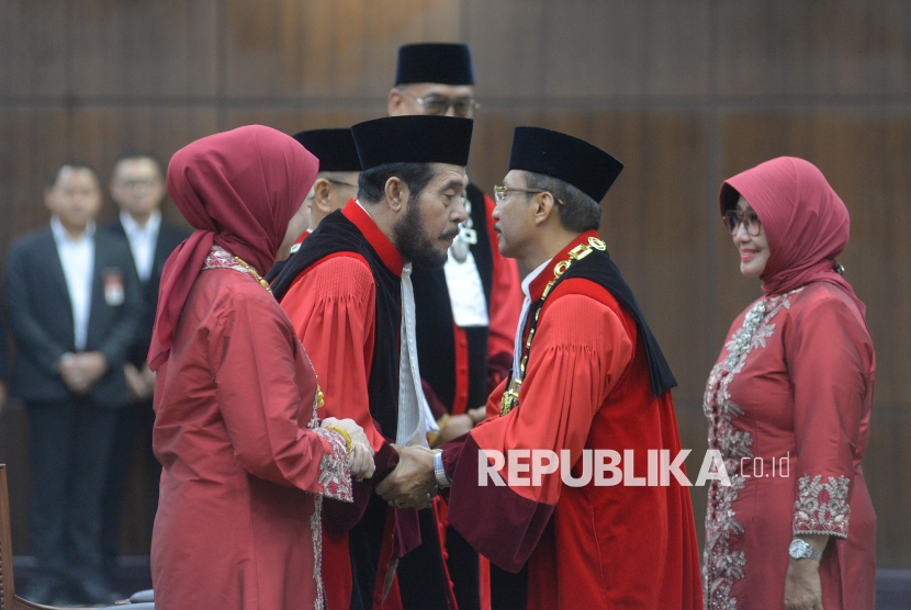 Ketua Hakim Mahkamah Konstitusi (MK) Suhartoyo berjabat tangan dengan Hakim Mahkamah Konstitusi (MK) purnabakti Anwar Usman dalam acara wisuda purnabakti dan penyambutan hakim konstitusi di Gedung Mahkamah Konstitusi, Jakarta, Senin (13/4/2026). Mahkamah Konstitusi menggelar wisuda purnabakti Anwar Usman serta menyambut hakim konstitusi baru Adies Kadir dan Liliek Prisbawono Adi. Anwar Usman mengakhiri masa pengabdiannya sebagai hakim konstitusi selama 15 tahun pada 6 April 2026. Sedangkan, Liliek Prisbawono Adi resmi menjadi hakim konstitusi menggantikan Anwar Usman yang memasuki masa pensiun. Pada kesempatan yang sama, MK juga menyambut Hakim Konstitusi Adies Kadir yang telah lebih dahulu mengucapkan sumpah jabatan sebagai hakim konstitusi menggantikan Arief Hidayat. (FOTO : Republika/Prayogi)