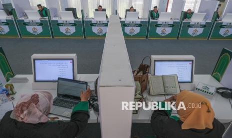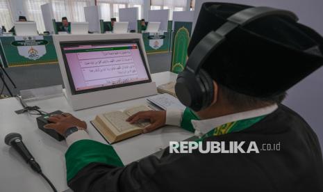 REPUBLIKA.CO.ID, KENDARI -- Dewan hakim mendengarkan peserta membacakan ayat suci Al Quran pada babak penyisihan lomba cabang Tafsir Bahasa Arab di Aula Pancasila BPMP Sultra, Kendari, Sulawesi Tenggara, Selasa (14/10/2025).