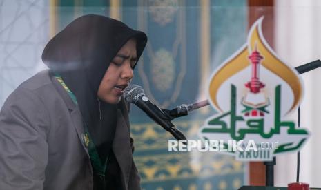 Peserta (Qari) Arju Najla Karima dari Provinsi Jawa Barat membacakan ayat suci Al Quran pada babak penyisihan lomba cabang Tafsir Bahasa Arab di Aula Pancasila BPMP Sultra, Kendari, Sulawesi Tenggara, Selasa (14/10/2025). Sebanyak 38 Qari dari 38 Provinsi memperebutkan tiket final pada cabang lomba hafalan Al Quran 30 Juz dan Tafsir Bahasa Arab STQH Nasional ke-28 di Sulawesi Tenggara. (FOTO : ANTARA FOTO)