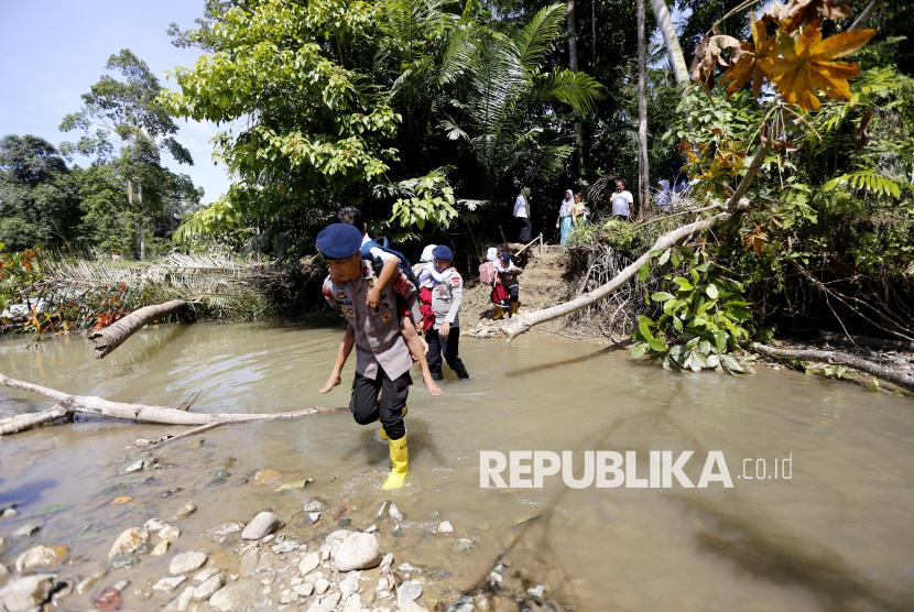 REPUBLIKA.CO.ID, GORONTALO -- Sejumlah personel Brimob Polda Gorontalo menggendong pelajar menyeberangi sungai di Desa Molalahu, Kabupaten Gorontalo, Gorontalo, Rabu (14/1/2026).