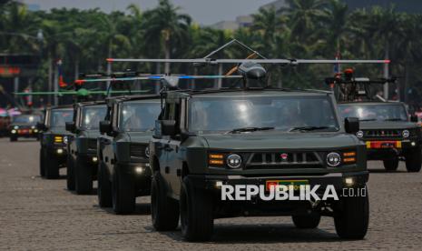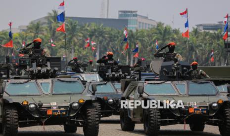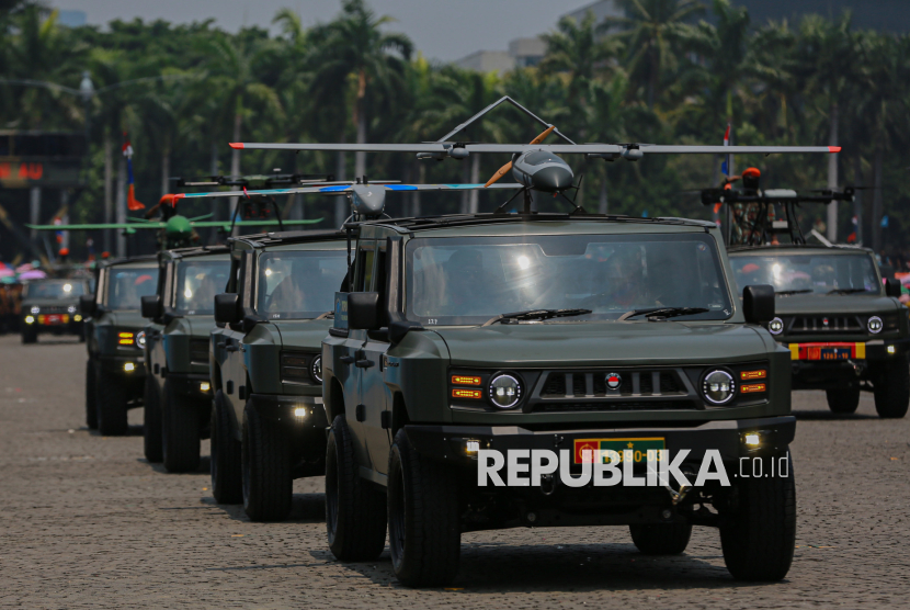 Sejumlah Alutsista TNI ditunjukan saat defile dalam peringatan HUT ke-80 TNI di kawasan Silang Monas, Jakarta, Ahad (5/10/2025). Pada peringatan HUT ke-80 TNI mengangkat tema besar TNI Prima, TNI Rakyat, Indonesia Maju. Selain upacara, gelaran HUT ke-80 TNI ini menampilkan sejumlah atraksi pesawat tempur, terjung payung, pengibaran bendera Merah Putih di atas langit Jakarta hingga simulasi pembebasan tawanan oleh pasukan TNI. (FOTO : Republika/Thoudy Badai)
