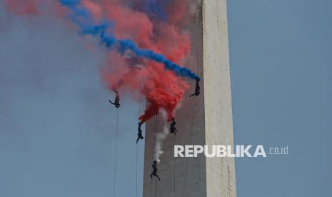 Prajurit TNI melakukan atraksi rappeling dari atas tugu Monumen Nasional (Monas) saat peringatan HUT ke-80 TNI di kawasan Silang Monas, Jakarta, Ahad (5/10/2025). Pada peringatan HUT ke-80 TNI mengangkat tema besar TNI Prima, TNI Rakyat, Indonesia Maju. Selain upacara, gelaran HUT ke-80 TNI ini menampilkan sejumlah atraksi pesawat tempur, terjung payung, pengibaran bendera Merah Putih di atas langit Jakarta hingga simulasi pembebasan tawanan oleh pasukan TNI. (FOTO : Republika/Thoudy Badai)