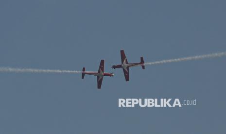 REPUBLIKA.CO.ID, JAKARTA -- Atraksi pesawat Jupiter Aerobatic Team dari TNI AU saat upacara HUT ke-80 TNI di kawasan Silang Monas, Jakarta, Ahad (5/10/2025).