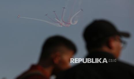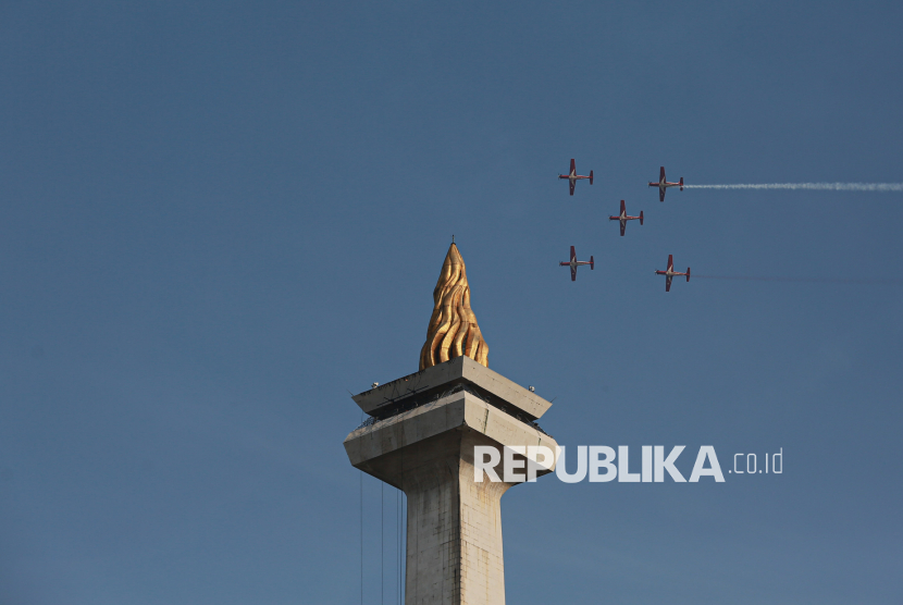 Atraksi pesawat Jupiter Aerobatic Team dari TNI AU saat upacara HUT ke-80 TNI di kawasan Silang Monas, Jakarta, Ahad (5/10/2025). Pada peringatan HUT ke-80 TNI mengangkat tema besar TNI Prima, TNI Rakyat, Indonesia Maju. Selain upacara, gelaran HUT ke-80 TNI ini menampilkan sejumlah atraksi pesawat tempur, terjung payung, pengibaran bendera Merah Putih di atas langit Jakarta hingga simulasi pembebasan tawanan oleh pasukan TNI. (FOTO : Republika/Thoudy Badai)