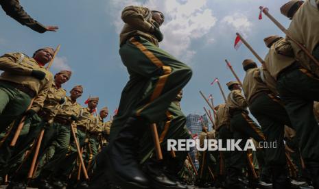 Anggota Korps Kadet Indonesia mengikuti defile pasukan saat peringatan HUT ke-80 TNI di kawasan Silang Monas, Jakarta, Ahad (5/10/2025). Pada peringatan HUT ke-80 TNI mengangkat tema besar TNI Prima, TNI Rakyat, Indonesia Maju. Selain upacara, gelaran HUT ke-80 TNI ini menampilkan sejumlah atraksi pesawat tempur, terjung payung, pengibaran bendera Merah Putih di atas langit Jakarta hingga simulasi pembebasan tawanan oleh pasukan TNI. (FOTO : Republika/Thoudy Badai)