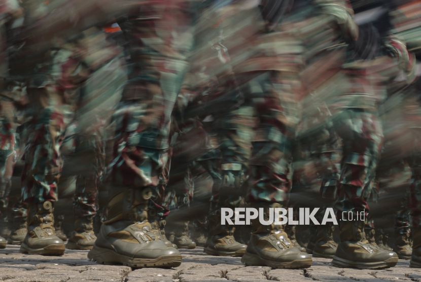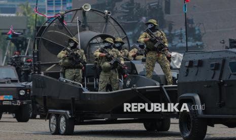 Prajurit TNI mengikuti defile pasukan saat peringatan HUT ke-80 TNI di kawasan Silang Monas, Jakarta, Ahad (5/10/2025). Pada peringatan HUT ke-80 TNI mengangkat tema besar TNI Prima, TNI Rakyat, Indonesia Maju. Selain upacara, gelaran HUT ke-80 TNI ini menampilkan sejumlah atraksi pesawat tempur, terjung payung, pengibaran bendera Merah Putih di atas langit Jakarta hingga simulasi pembebasan tawanan oleh pasukan TNI. (FOTO : Republika/Thoudy Badai)