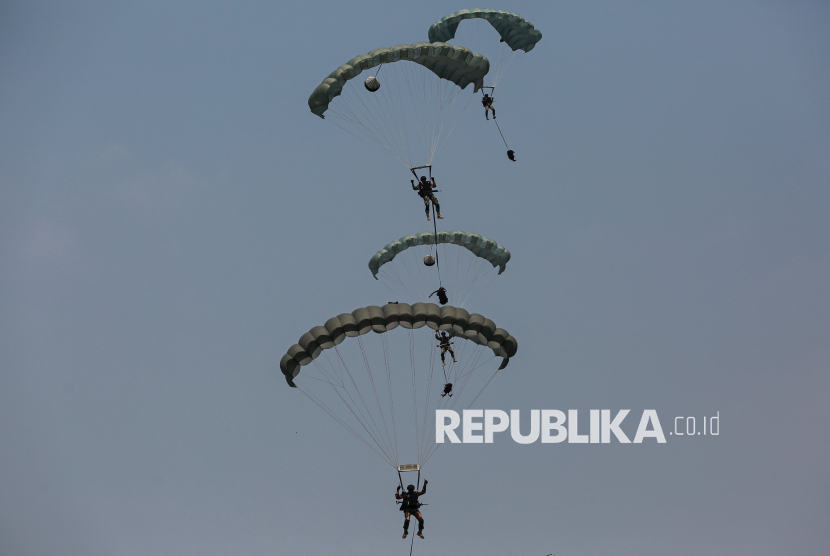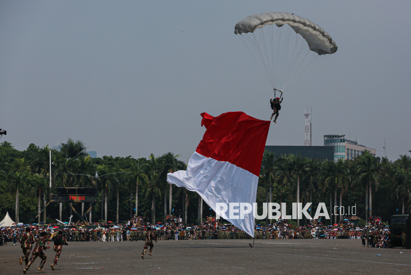 Prajurit TNI melakukan atraksi terjung payung saat acara peringatan HUT ke-80 TNI di kawasan Silang Monas, Jakarta, Ahad (5/10/2025). Pada peringatan HUT ke-80 TNI mengangkat tema besar TNI Prima, TNI Rakyat, Indonesia Maju. Selain upacara, gelaran HUT ke-80 TNI ini menampilkan sejumlah atraksi pesawat tempur, terjung payung, pengibaran bendera Merah Putih di atas langit Jakarta hingga simulasi pembebasan tawanan oleh pasukan TNI. (FOTO : Republika/Thoudy Badai)