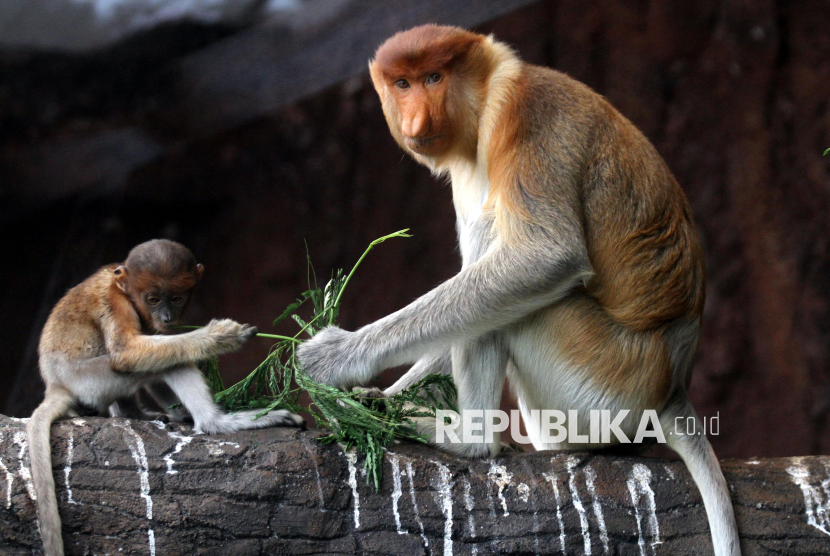 Seekor bayi bekantan (Nasalis larvatus) berusia 2,5 bulan bermain dalam pengawasan induknya di Batu Secret Zoo, Jatim Park 2, Kota Batu, Jawa Timur, Selasa (14/4/2026). Pengelola taman satwa tersebut berhasil menambah populasi primata endemik Kalimantan yang terancam punah itu dari lima ekor menjadi 10 ekor melalui program konservasi berupa pengembangbiakan yang dilakukan dalam dua tahun terakhir. (FOTO : ANTARA FOTO/Ari Bowo Sucipto)