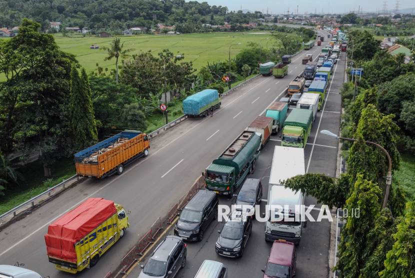 Sejumlah truk terjebak macet saat hendak menuju Pelabuhan Merak di Gerbang Tol Merak, Kota Cilegon, Banten, Rabu (4/3/2026). Antrean kendaraan angkutan barang yang mengular hingga keluar area pelabuhan tersebut terjadi akibat meningkatnya volume kendaraan yang hendak menyeberang ke Pulau Sumatera serta terhambatnya proses bongkar muat kapal akibat cuaca buruk dan angin kencang yang terjadi di perairan Selat Sunda. (FOTO : ANTARA FOTO/Muhammad Bagus Khoirunas)