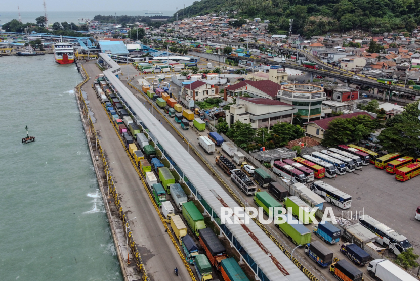 REPUBLIKA.CO.ID, CILEGON -- Sejumlah truk antre saat menunggu bongkar muat kapal di Pelabuhan Merak, Kota Cilegon, Banten, Rabu (4/3/2026).