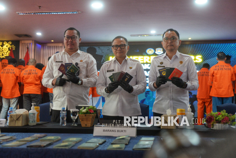 Plt Dirjen Imigrasi Yuldi Yusman (tengah) didampingi Kepala Kantor Wilayah Ditjen Imigrasi DKI Jakarta Pamuji Raharja (kanan) dan Kepala Subdirektorat Pengawasan Arief Eka Riyanto (kiri) menunjukkan barang bukti usai memberikan keterangan saat konferensi pers hasil penindakan Operasi Wirawaspada di Gedung Direktorat Jenderal Imigrasi, Jakarta, Rabu (8/10/2025). Direktorat Jenderal Imigrasi menindak 196 WNA bermasalah di wilayah Jabodetabek selama Operasi Wirawaspada yang berlangsung pada 3–5 Oktober 2025. Mayoritas WNA yang terjaring berasal dari Nigeria, dengan pelanggaran terbanyak berupa penyalahgunaan izin tinggal. (FOTO : Republika/Prayogi)