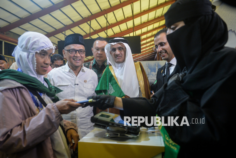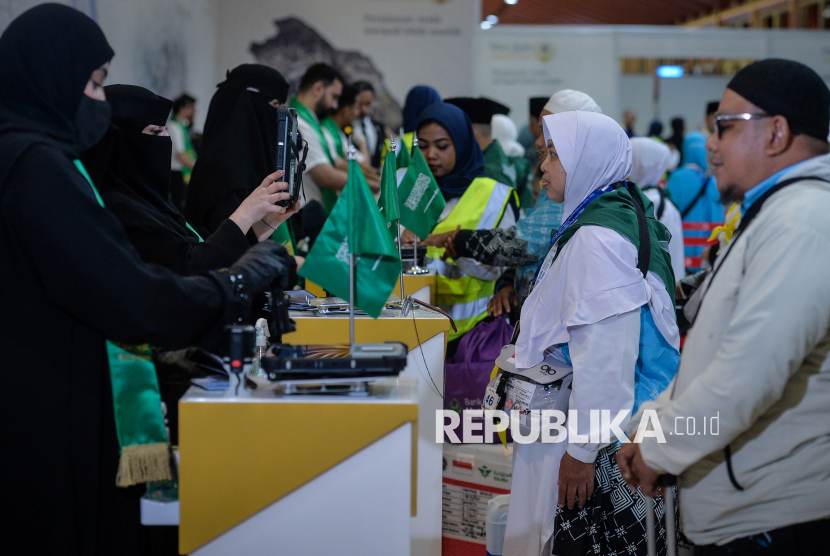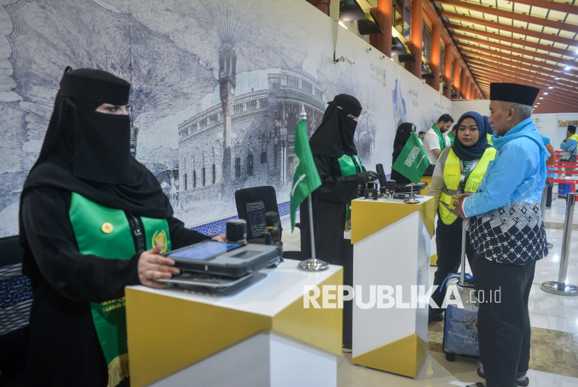 REPUBLIKA.CO.ID, TANGERANG -- Petugas imigrasi Arab Saudi memeriksa dokumen calon haji kelompok terbang lima embarkasi Jakarta Pondok Gede yang menggunakan layanan Fast Track Haji Makkah Route di Terminal 2F Bandara Soekarno-Hatta, Tangerang, Banten, Sabtu (25/4/2026).