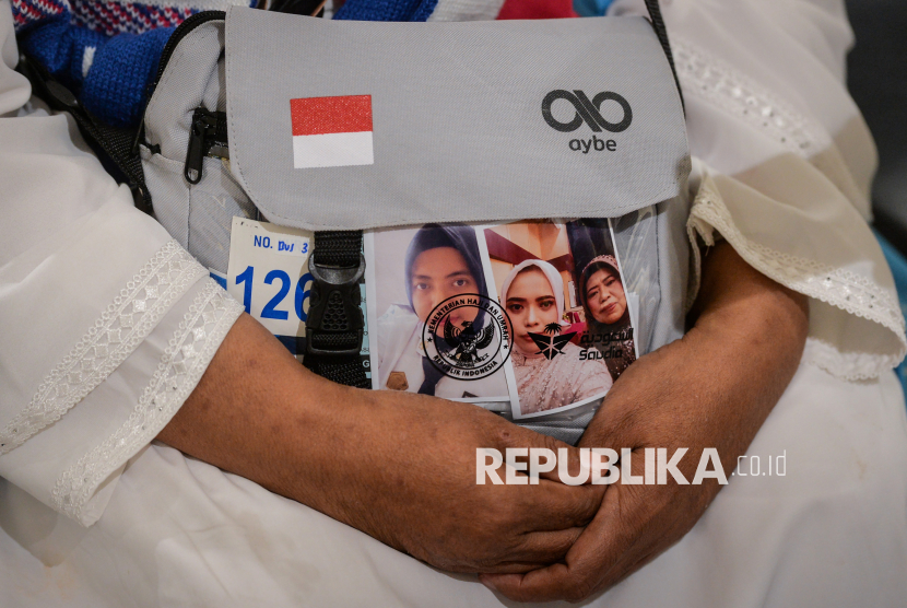Calon haji kelompok terbang lima embarkasi Jakarta Pondok Gede memegang tasnya saat menunggu layanan Fast Track Haji Makkah Route di Terminal 2F Bandara Soekarno-Hatta, Tangerang, Banten, Sabtu (25/4/2026). Layanan Fast Track Haji Makkah Route di Bandara Soekarno-Hatta tersebut untuk memudahkan calon haji dalam pemeriksaan dokumen sehingga lebih cepat dan efisien serta tidak perlu melakukan pemeriksaan dokumen keimigrasian setibanya di Arab Saudi. (FOTO : ANTARA FOTO/Putra M. Akbar)