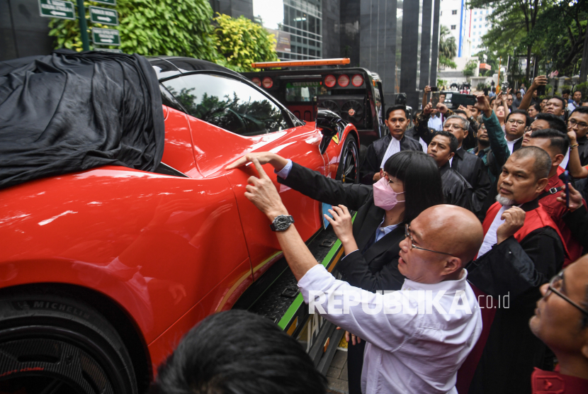 REPUBLIKA.CO.ID, JAKARTA -- Majelis Hakim tipikor memeriksa barang bukti berupa mobil Ferrari untuk terdakwa kasus dugaan suap terhadap putusan lepas perkara korupsi pemberian fasilitas ekspor minyak sawit mentah (CPO) Ariyanto Bakri dan Marcella Santoso di Pengadilan Tipikor, Jakarta, Rabu (14/1/2026).