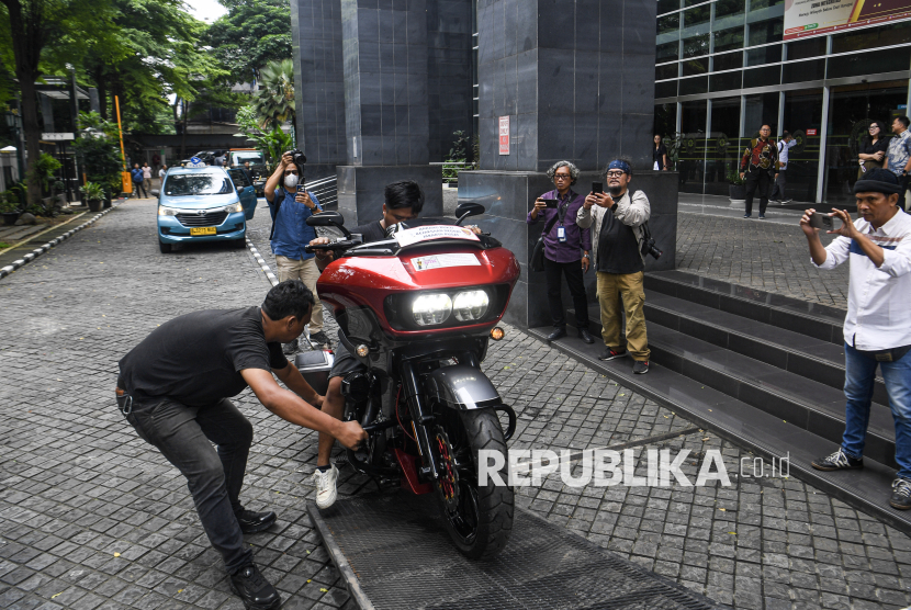 Petugas menurunkan barang bukti berupa sepeda motor Harley Davidson untuk Terdakwa kasus dugaan suap terhadap putusan lepas perkara korupsi pemberian fasilitas ekspor minyak sawit mentah (CPO) Ariyanto Bakri dan Marcella Santoso di Pengadilan Tipikor, Jakarta, Rabu (14/1/2026). Jaksa Penuntut Umum (JPU) menghadirkan barang berupa mobil Ferrari, dua sepeda motor Harley Davidson dan satu sepeda road bike untuk perkara korupsi korporasi penerima fasilitas ekspor crude palm oil (CPO) sekaligus kasus tindak pidana pencucian uang (TPPU). (FOTO : ANTARA FOTO/Muhammad Adimaja)