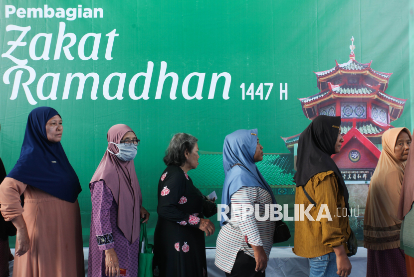 REPUBLIKA.CO.ID, SURABAYA -- Warga antre pembagian zakat mal di Masjid Muhammad Cheng Hoo, Surabaya, Jawa Timur, Rabu (4/3/2026).