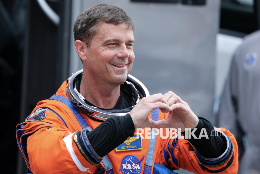 Komandan Reid Wiseman dari NASA keluar dari Gedung Operasi dan Pemeriksaan Neil A. Armstrong menuju Landasan Peluncuran 39B sebagai bagian dari persiapan peluncuran Artemis II di Titusville, Florida, AS, Rabu (1/4/2026) waktu setempat. Artemis II adalah misi kedua dalam program eksplorasi Bulan Artemis milik NASA. (FOTO : EPA/CRISTOBAL HERRERA-ULASHKEVICH)
