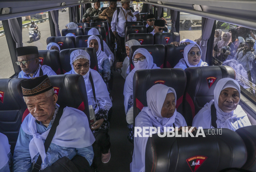 Jamaah calon haji berada di dalam bus saat tiba di Pelabuhan Residen Ternate, Maluku Utara, Selasa (28/4/2026). Sebanyak 19 jamaah calon haji kloter 13 asal Halmahera Barat itu tiba Ternate menggunakan speedboat (kapal cepat) untuk menuju ke Asrama Haji Transit Ternate yang dijadwalkan berangkat pada 29 April 2026 menuju embarkasi Makassar sebelum melanjutkan perjalanan ke Arab Saudi. (FOTO : ANTARA FOTO/Andri Saputra)
