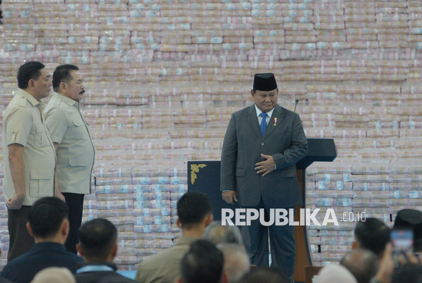 Presiden Prabowo Subianto bersiap memberikan sambutan dalam acara penyerahan denda administratif dan penyelamatan keuangan negara serta penguasaan kembali kawasan hutan tahap VI di Kejaksaan Agung, Jakarta, Jumat (10/4/2026). Satuan Tugas Penertiban Kawasan Hutan (Satgas PKH) menyetorkan dana sebesar Rp11,42 triliun ke kas negara yang berasal dari berbagai sumber, mulai dari denda administratif di bidang kehutanan hingga penerimaan pajak. Penyerahan dana tersebut merupakan bentuk transparansi kinerja Satgas PKH kepada publik dalam upaya penyelamatan keuangan negara. (FOTO : Republika/Prayogi)