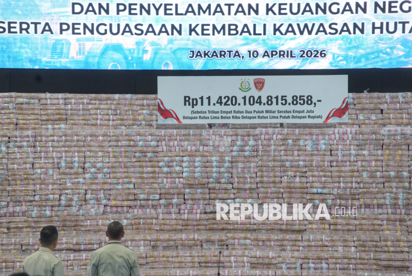 Tumpukan uang diperlihatkan dalam acara penyerahan denda administratif dan penyelamatan keuangan negara serta penguasaan kembali kawasan hutan tahap VI di Kejaksaan Agung, Jakarta, Jumat (10/4/2026). Satuan Tugas Penertiban Kawasan Hutan (Satgas PKH) menyetorkan dana sebesar Rp11,42 triliun ke kas negara yang berasal dari berbagai sumber, mulai dari denda administratif di bidang kehutanan hingga penerimaan pajak. Penyerahan dana tersebut merupakan bentuk transparansi kinerja Satgas PKH kepada publik dalam upaya penyelamatan keuangan negara. (FOTO : Republika/Prayogi)