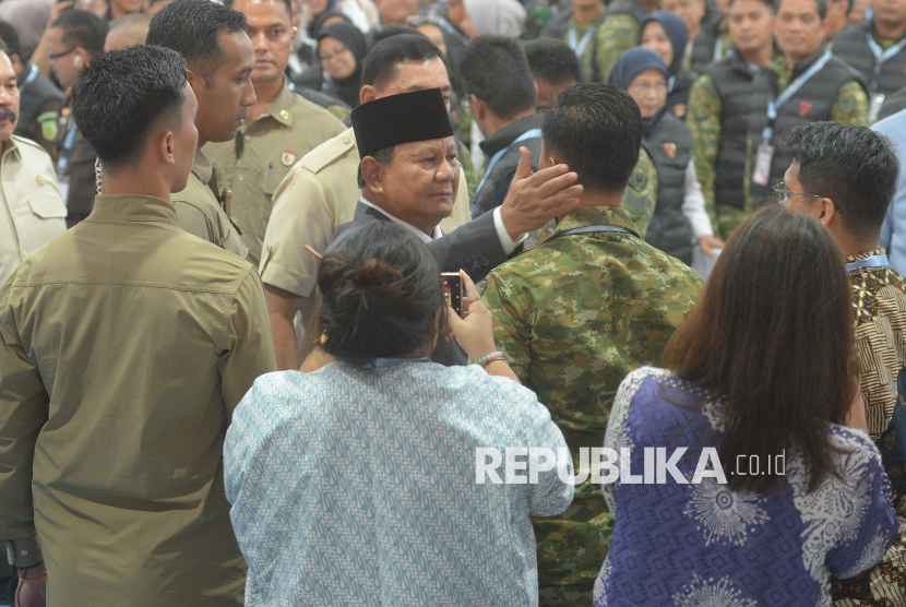 Presiden Prabowo Subianto menyalami anggota Satuan Tugas Penertiban Kawasan Hutan (Satgas PKH) usai acara penyerahan denda administratif dan penyelamatan keuangan negara serta penguasaan kembali kawasan hutan tahap VI di Kejaksaan Agung, Jakarta, Jumat (10/4/2026). Satuan Tugas Penertiban Kawasan Hutan (Satgas PKH) menyetorkan dana sebesar Rp11,42 triliun ke kas negara yang berasal dari berbagai sumber, mulai dari denda administratif di bidang kehutanan hingga penerimaan pajak. Penyerahan dana tersebut merupakan bentuk transparansi kinerja Satgas PKH kepada publik dalam upaya penyelamatan keuangan negara. (FOTO : Republika/Prayogi)