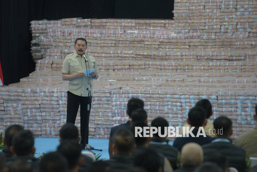 Jaksa Agung yang juga Wakil Ketua I Pengarah Satuan Tugas Penertiban Kawasan Hutan (Satgas PKH) ST Burhanuddin menyampaikan laporan dalam acara penyerahan denda administratif dan penyelamatan keuangan negara serta penguasaan kembali kawasan hutan tahap VI di Kejaksaan Agung, Jakarta, Jumat (10/4/2026). Satuan Tugas Penertiban Kawasan Hutan (Satgas PKH) menyetorkan dana sebesar Rp11,42 triliun ke kas negara yang berasal dari berbagai sumber, mulai dari denda administratif di bidang kehutanan hingga penerimaan pajak. Penyerahan dana tersebut merupakan bentuk transparansi kinerja Satgas PKH kepada publik dalam upaya penyelamatan keuangan negara. (FOTO : Republika/Prayogi)