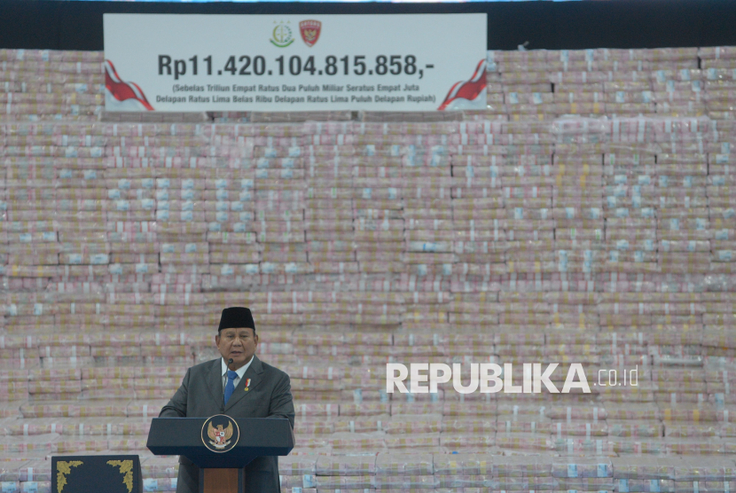 Presiden Prabowo Subianto memberikan sambutan dalam acara penyerahan denda administratif dan penyelamatan keuangan negara serta penguasaan kembali kawasan hutan tahap VI di Kejaksaan Agung, Jakarta, Jumat (10/4/2026). Satuan Tugas Penertiban Kawasan Hutan (Satgas PKH) menyetorkan dana sebesar Rp11,42 triliun ke kas negara yang berasal dari berbagai sumber, mulai dari denda administratif di bidang kehutanan hingga penerimaan pajak. Penyerahan dana tersebut merupakan bentuk transparansi kinerja Satgas PKH kepada publik dalam upaya penyelamatan keuangan negara. (FOTO : Republika/Prayogi)