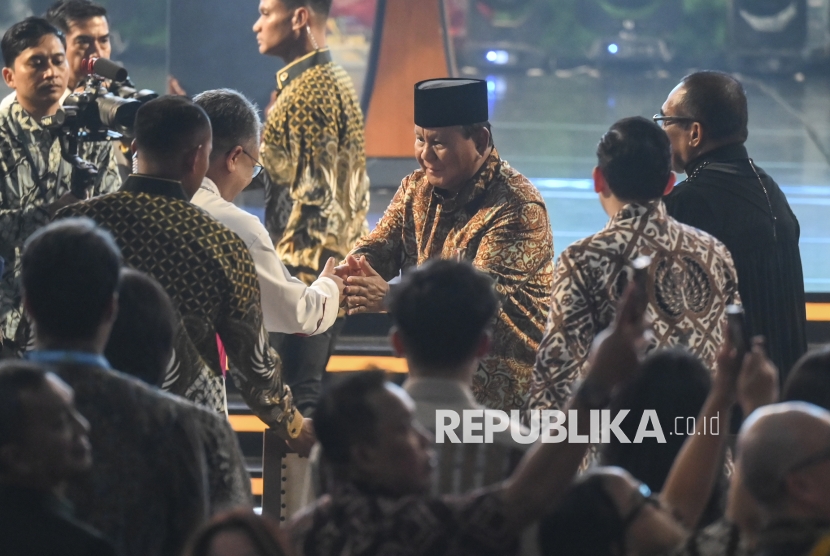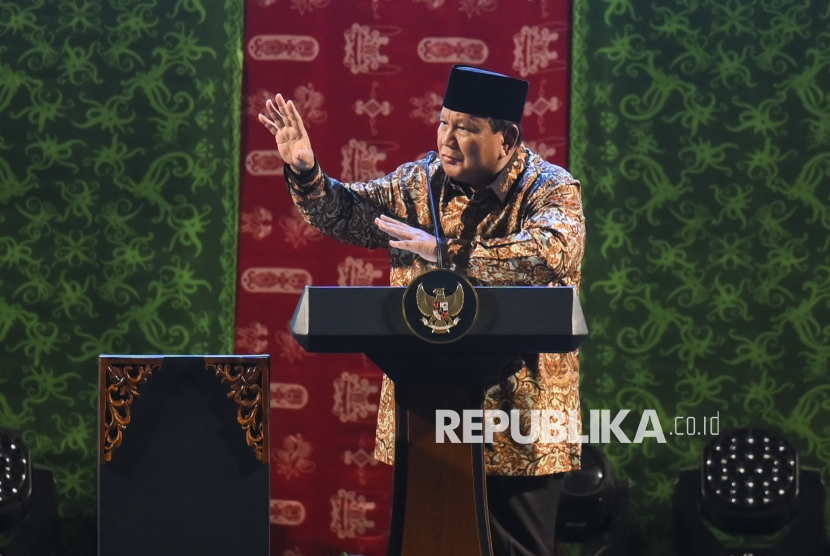 Presiden Prabowo Subianto memberikan arahan saat menghadiri perayaan Natal Nasional 2025 di Tenis Indoor Senayan, Jakarta, Senin (5/1/2026). Perayaan Natal Nasional 2025 mengusung tema Allah Hadir untuk Menyelamatkan Keluarga. (FOTO : ANTARA FOTO/Hafidz Mubarak A)