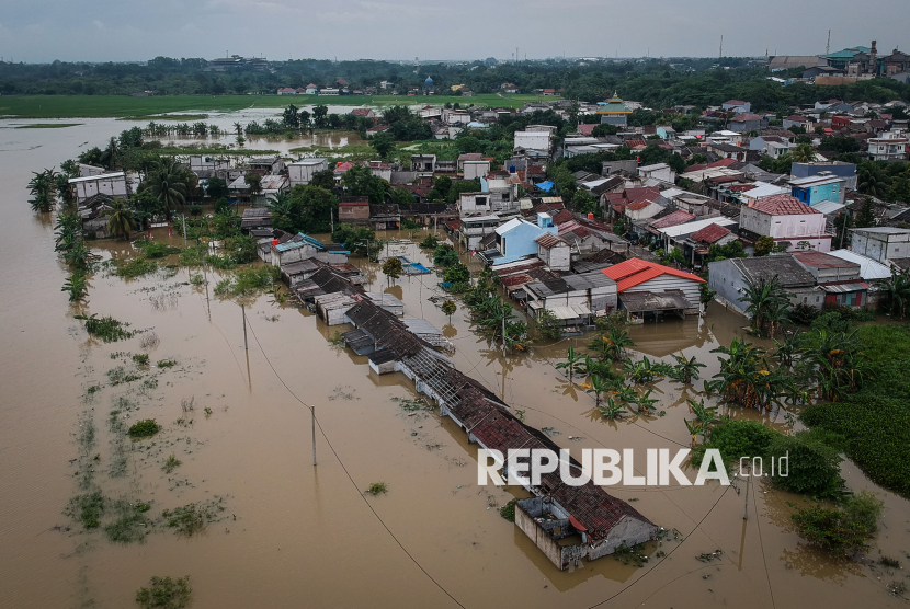 Foto udara kawasan permukiman yang terendam banjir di Perumahan Taman Cikande, Jayanti, Kabupaten Tangerang, Banten, Rabu (14/1/2026). Banjir setinggi 60 centimeter hingga dua meter akibat luapan Sungai Cidurian tersebut dipicu tingginya intensitas hujan dalam tiga hari terakhir yang membuat ratusan rumah terendam dan sebanyak 222 kepala keluarga terdampak. (FOTO : ANTARA FOTO/Putra M. Akbar)