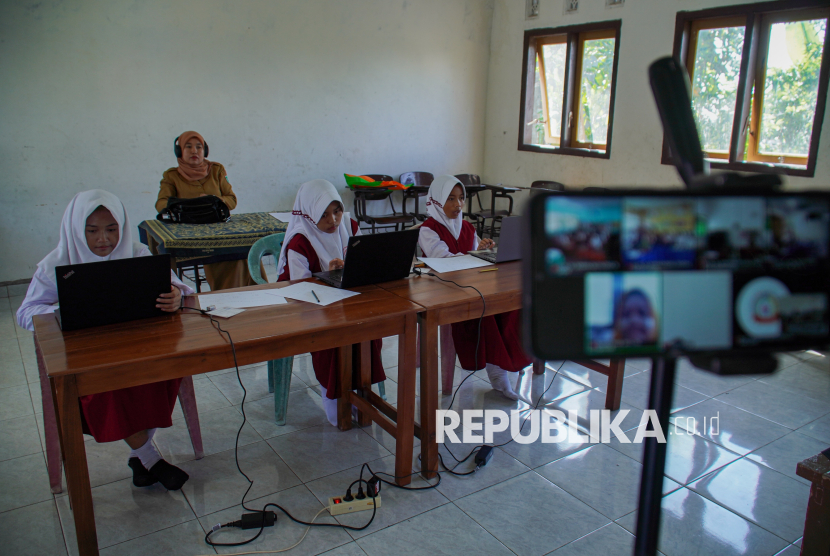 Sejumlah siswi SDN Supiturang 02 mengikuti pelaksanaan Tes Kemampuan Akademik (TKA) di ruang kelas madrasah, Desa Supiturang, Kecamatan Pronojiwo, Lumajang, Jawa Timur, Senin (20/4/2026). Ujian yang diikuti 21 siswa di ruang madrasah dilaksanakan secara bergelombang karena keterbatasan perangkat dan jaringan internet setelah bangunan sekolah rusak akibat erupsi Gunung Semeru. (FOTO : ANTARA FOTO/Irfan Sumanjaya)