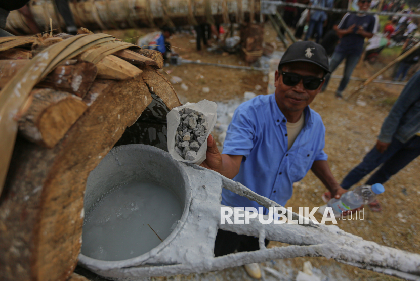 Warga menyiapkan bubuk karbit untuk acara tradisi adu kuluwung atau meriam tradisional di Desa Sukaresmi, Kecamatan Sukamakmur, Kabupaten Bogor, Jawa Barat, Ahad (29/3/2026). Pelaksanaan tradisi adu kuluwung tersebut dilakukan di dua desa, yakni Desa Sukaresmi dengan Desa Sukadamai yang rutin digelar setiap satu pekan usai lebaran Idul Fitri. (FOTO : Republika/Thoudy Badai)