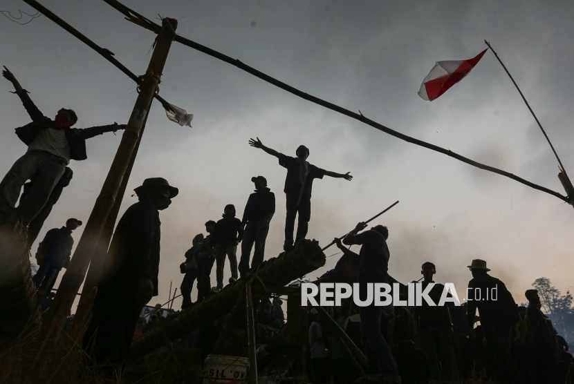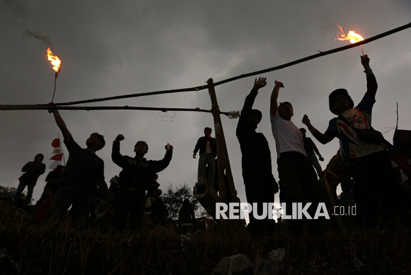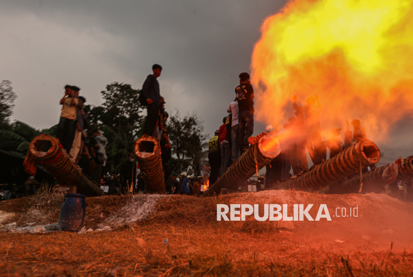 Warga menyalakan kuluwung atau meriam tradisional di Desa Sukaresmi, Kecamatan Sukamakmur, Kabupaten Bogor, Jawa Barat, Ahad (29/3/2026). Pelaksanaan tradisi adu kuluwung tersebut dilakukan di dua desa, yakni Desa Sukaresmi dengan Desa Sukadamai yang rutin digelar setiap satu pekan usai lebaran Idul Fitri. (FOTO : Republika/Thoudy Badai)