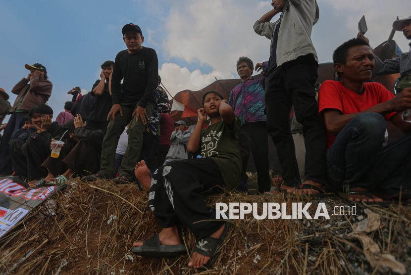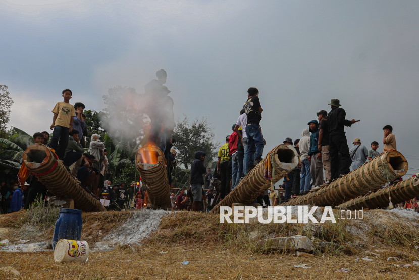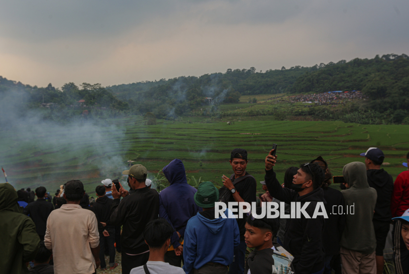 Warga menyaksikan tradisi adu kuluwung atau meriam tradisional di Desa Sukaresmi, Kecamatan Sukamakmur, Kabupaten Bogor, Jawa Barat, Ahad (29/3/2026). Pelaksanaan tradisi adu kuluwung tersebut dilakukan di dua desa, yakni Desa Sukaresmi dengan Desa Sukadamai yang rutin digelar setiap satu pekan usai lebaran Idul Fitri. (FOTO : Republika/Thoudy Badai)