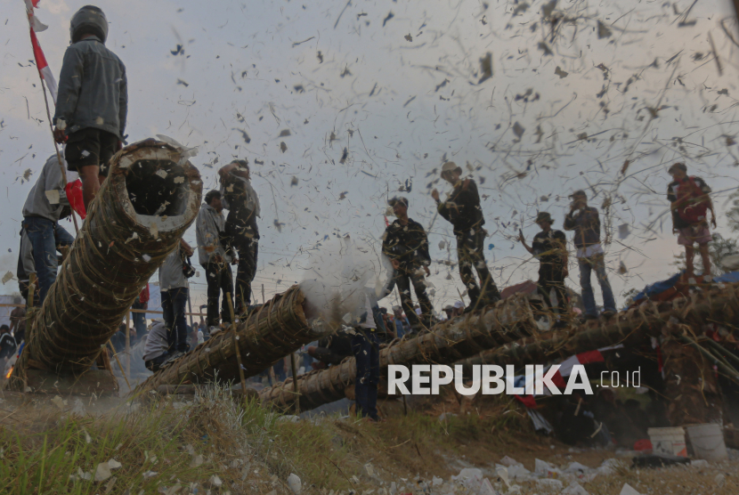 Warga menyalakan petasan saat acara adu kuluwung atau meriam tradisional di Desa Sukaresmi, Kecamatan Sukamakmur, Kabupaten Bogor, Jawa Barat, Ahad (29/3/2026). Pelaksanaan tradisi adu kuluwung tersebut dilakukan di dua desa, yakni Desa Sukaresmi dengan Desa Sukadamai yang rutin digelar setiap satu pekan usai lebaran Idul Fitri. (FOTO : Republika/Thoudy Badai)