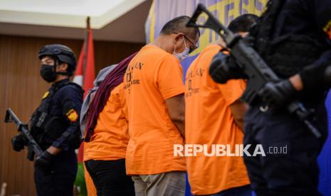 REPUBLIKA.CO.ID, TANGERANG -- Petugas berjaga di samping tersangka yang dihadirkan saat ungkap kasus penyelundupan benih bening lobster (BBL) di Kantor Bea Cukai Bandara Soekarno-Hatta, Kota Tangerang, Banten, Kamis (16/10/2025).