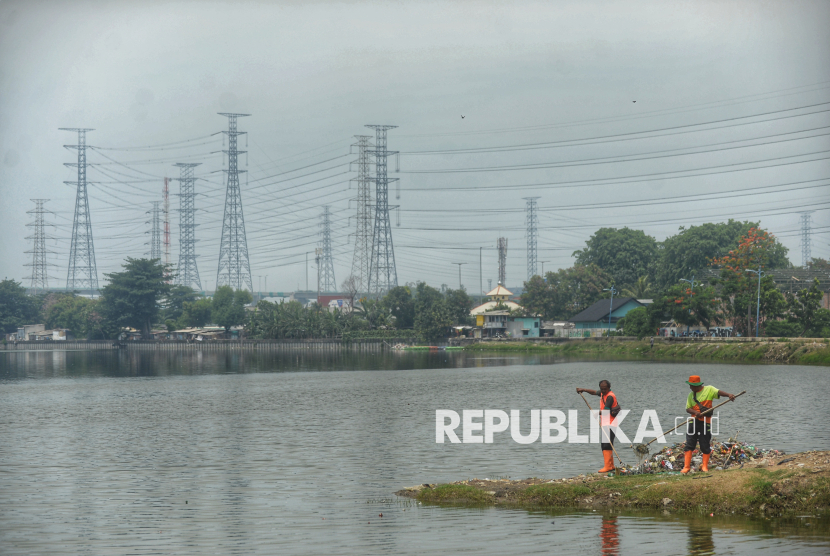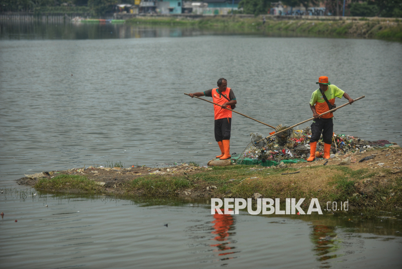 Petugas UPS Badan Air mengambil sampah di Area Waduk Cincin, Jakarta, Senin (1/12/2025). Terciptanya Waduk Cincin yang bersih dapat dimanfaatkan warga untuk kegiatan seperti rekreasi, olahraga, memancing, dan menikmati pemandangan. (FOTO : Republika/Prayogi)
