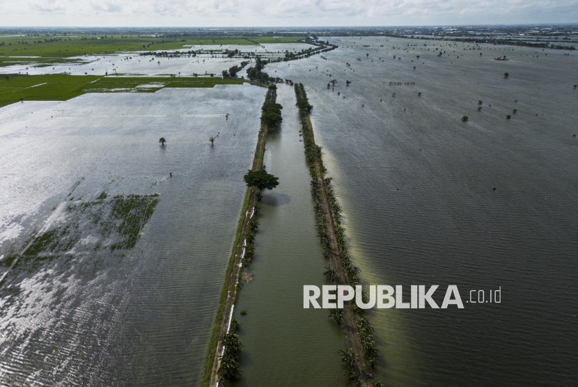 Foto udara area persawahan yang terendam banjir di Dusun Ngelo, Desa Karangrowo, Kudus, Jawa Tengah, Senin (19/1/2026). Berdasarkan data Badan Penanggulangan Bencana Daerah (BPBD) Kabupaten Kudus banjir akibat cuaca ekstrem sejak Jumat (9/1) itu telah merendam 1.970 hektare sawah di tujuh kecamatan. (FOTO : ANTARA FOTO/Aprillio Akbar)