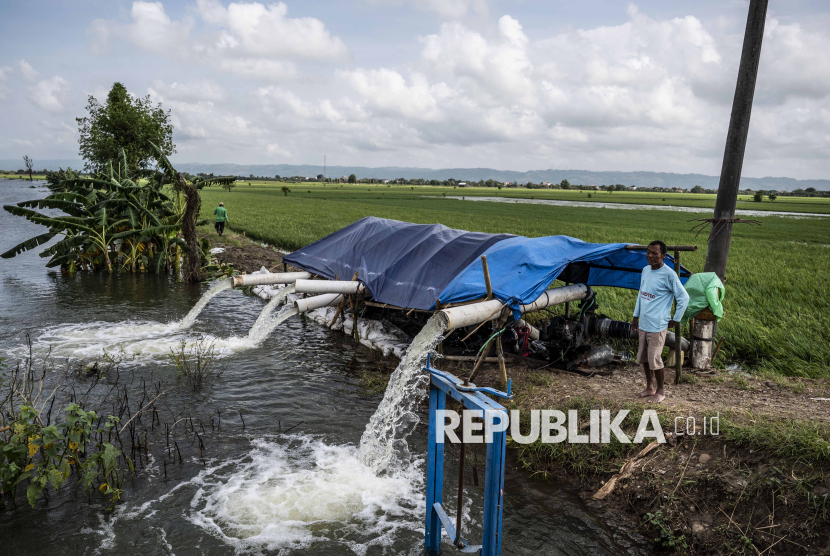 Petani berdiri di dekat mesin pompa yang digunakan untuk menyedot air banjir dari sawahnya di Dusun Ngelo, Desa Karangrowo, Kudus, Jawa Tengah, Senin (19/1/2026). Berdasarkan data Badan Penanggulangan Bencana Daerah (BPBD) Kabupaten Kudus banjir akibat cuaca ekstrem sejak Jumat (9/1) itu telah merendam 1.970 hektare sawah di tujuh kecamatan. (FOTO : ANTARA FOTO/Aprillio Akbar)