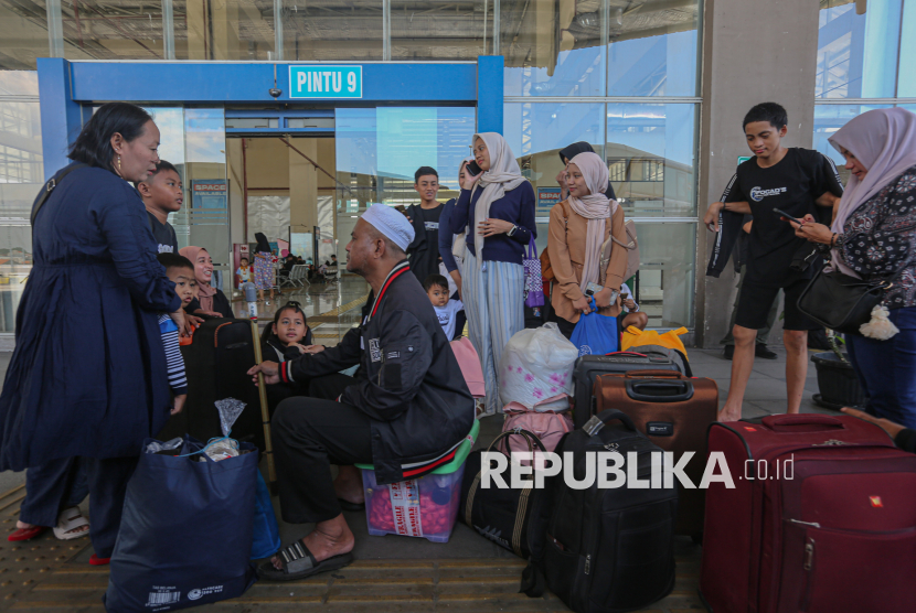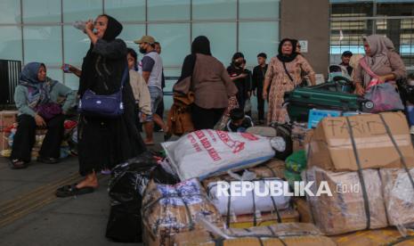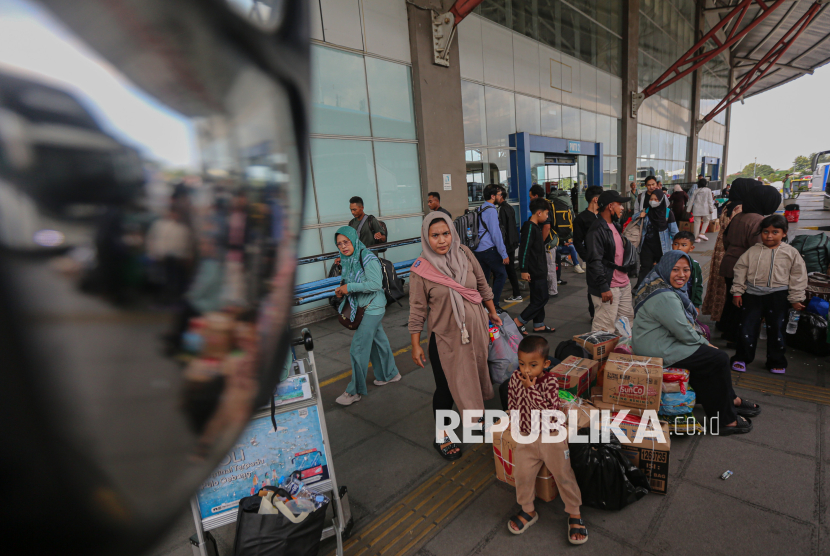 Calon penumpang saat menunggu bis untuk mudik ke kampung halamannya di Terminal Pulo Gebang, Jakarta Timur, Jumat (13/3/2026). Jumlah pemudik yang berangkat dari terminal Pulo Gebang mulai meningkat menjelang hari raya idul fitri. Berdasarkan data pada Kamis (12/3) atau H-8 lebaran, jumlah pemudik mencapai 2.898 penumpang dengan jumlah armada sebanyak 404 bus. Sementara untuk pumcak arus mudik diprediksi terjadi pada Selasa (17/3) mendatang. (FOTO : Republika/Thoudy Badai)