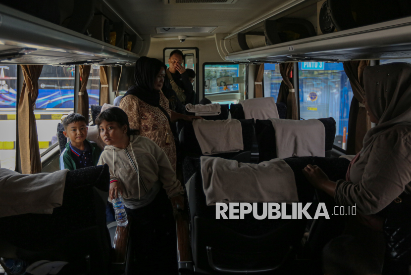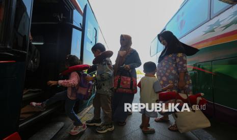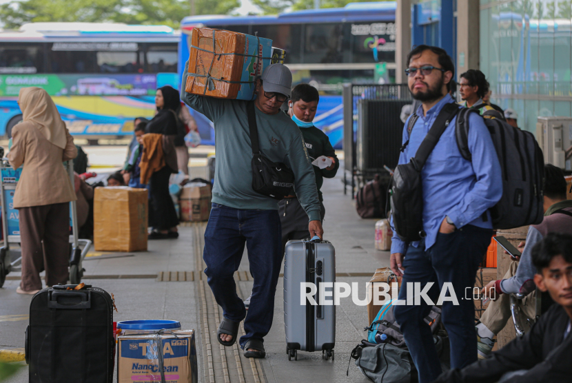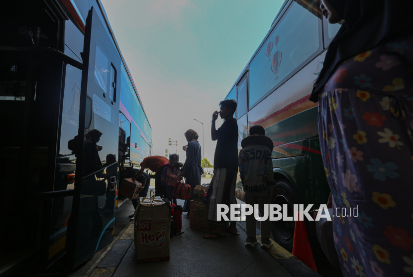 Penumpang menaikI bis untuk mudik ke kampung halamannya di Terminal Pulo Gebang, Jakarta Timur, Jumat (13/3/2026). Jumlah pemudik yang berangkat dari terminal Pulo Gebang mulai meningkat menjelang hari raya idul fitri. Berdasarkan data pada Kamis (12/3) atau H-8 lebaran, jumlah pemudik mencapai 2.898 penumpang dengan jumlah armada sebanyak 404 bus. Sementara untuk pumcak arus mudik diprediksi terjadi pada Selasa (17/3) mendatang. (FOTO : Republika/Thoudy Badai)