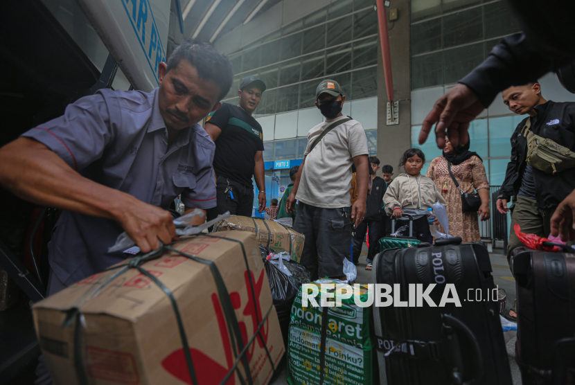 Penumpang menaikan barang bawaannya ke dalam bis di Terminal Pulo Gebang, Jakarta Timur, Jumat (13/3/2026). Jumlah pemudik yang berangkat dari terminal Pulo Gebang mulai meningkat menjelang hari raya idul fitri. Berdasarkan data pada Kamis (12/3) atau H-8 lebaran, jumlah pemudik mencapai 2.898 penumpang dengan jumlah armada sebanyak 404 bus. Sementara untuk pumcak arus mudik diprediksi terjadi pada Selasa (17/3) mendatang. (FOTO : Republika/Thoudy Badai)