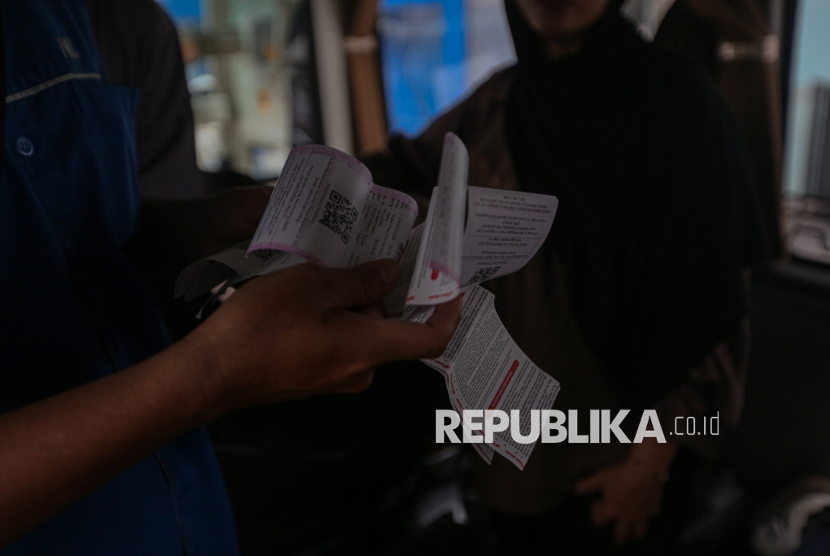 Petugas mengecek tiket keberangkatan penumpang di Terminal Pulo Gebang, Jakarta Timur, Jumat (13/3/2026). Jumlah pemudik yang berangkat dari terminal Pulo Gebang mulai meningkat menjelang hari raya idul fitri. Berdasarkan data pada Kamis (12/3) atau H-8 lebaran, jumlah pemudik mencapai 2.898 penumpang dengan jumlah armada sebanyak 404 bus. Sementara untuk pumcak arus mudik diprediksi terjadi pada Selasa (17/3) mendatang. (FOTO : Republika/Thoudy Badai)