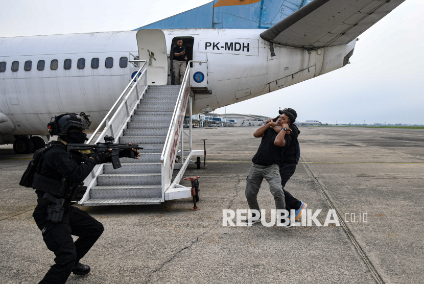 REPUBLIKA.CO.ID, SIDOARJO -- Prajurit Komando Pasukan Katak (Kopaska) TNI AL menyelamatkan sandera saat latihan pasukan khusus Kopaska TA 2026 di Lanudal Juanda, Sidoarjo, Jawa Timur, Senin (27/4/2026).
