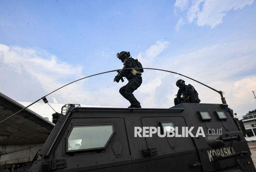 Prajurit Komando Pasukan Katak (Kopaska) TNI AL berlari di atas kendaraan taktis saat latihan pasukan khusus Kopaska TA 2026 di Lanudal Juanda, Sidoarjo, Jawa Timur, Senin (27/4/2026). Dalam latihan tersebut prajurit Kopaska ditekankan untuk mengutamakan faktor keamanan sehingga prajurit Kopaska dapat menjadi prajurit yang profesional dalam penanganan aksi terorisme atau gangguan keamanan di Indonesia. (FOTO : ANTARA FOTO/Muhammad Adimaja)
