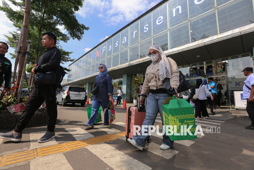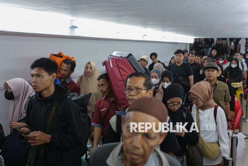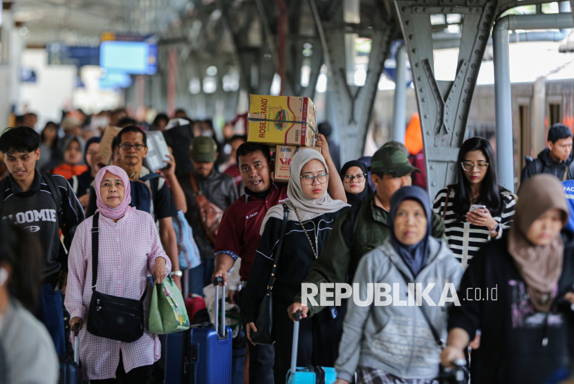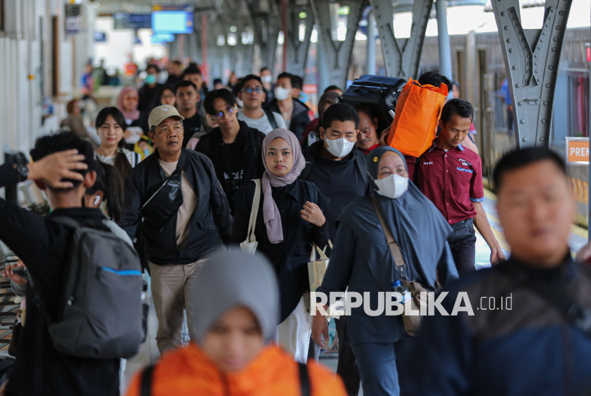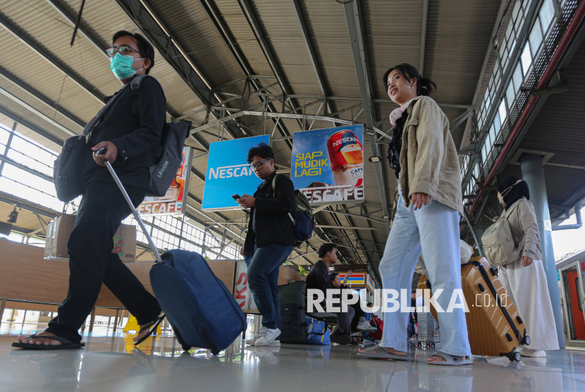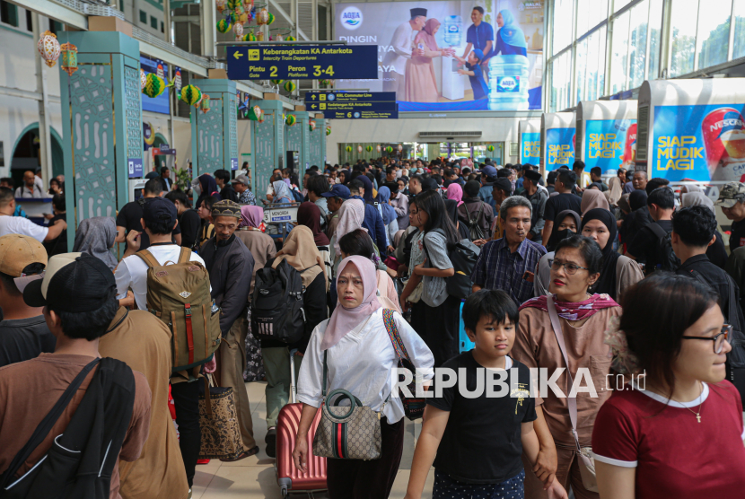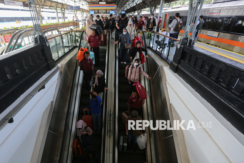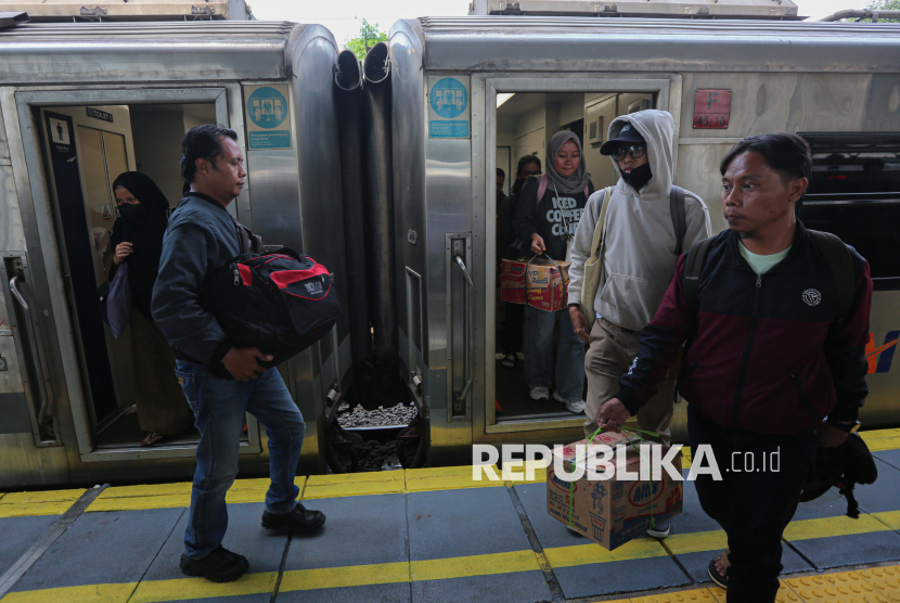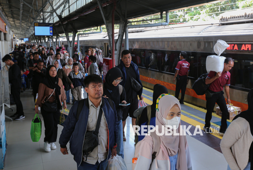 Pemudik tiba di Stasiun Pasar Senen, Jakarta, Selasa (24/3/2026). Berdasarkan data dari PT KAI Daop 1 Jakarta, jumlah pemudik yang tiba di Jakarta saat arus balik Selasa (24/3) mencapai 52.926 dengan rincian Stasiun Pasar Senen 18.458 Stasiun Gambir 16.610 penumpang. (FOTO : Republika/Thoudy Badai)