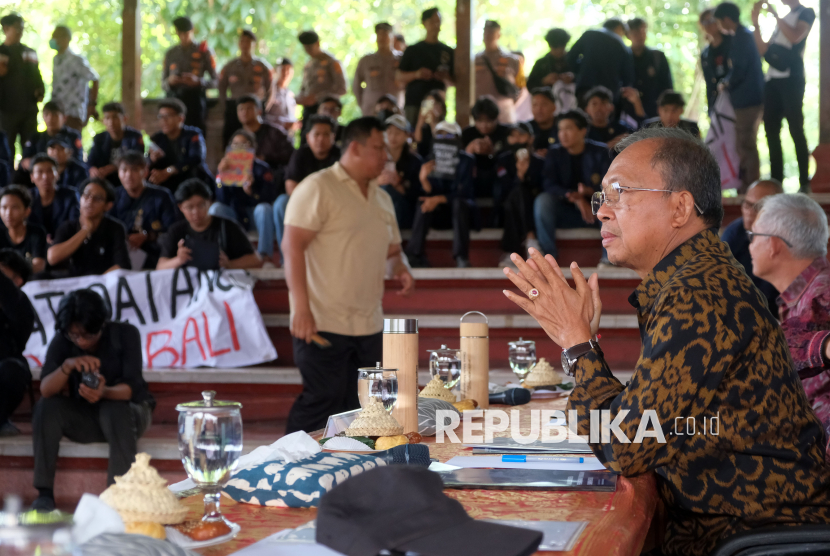 Gubernur Bali Wayan Koster (kanan) berdialog dengan mahasiswa peserta aksi seruan Bali Darurat Sampah di Wantilan DPRD Provinsi Bali, Denpasar, Bali, Rabu (22/4/2026). Ratusan mahasiswa menggelar aksi menuntut peningkatan sosialisasi kebijakan sampah, penyediaan fasilitas pengelolaan yang memadai, dan mendesak kejelasan pemerintah atas kebijakan terkait Tempat Pembuangan Akhir (TPA). (FOTO : ANTARA FOTO/Nyoman Hendra Wibowo)