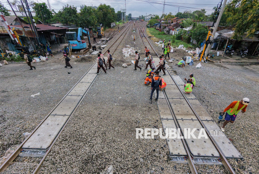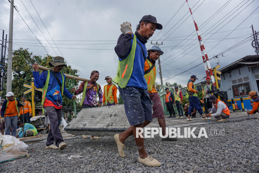 REPUBLIKA.CO.ID, PEKALONGAN -- Sejumlah pekerja melakukan pemasangan cor beton di perlintasan kereta api sebidang di Kota Pekalongan, Jawa Tengah, Jumat (6/3/2026).
